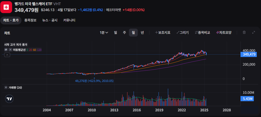 VHT는 벵가드(Vanguard)에서 운용하는 헬스케어 ETF로, XLV보다 더 넓은 범위의 기업에 분산 투자합니다. 대형주뿐만 아니라 중소형주도 포함되어 있어 섹터 전반에 걸친 균형 잡힌 투자가 가능합니다.