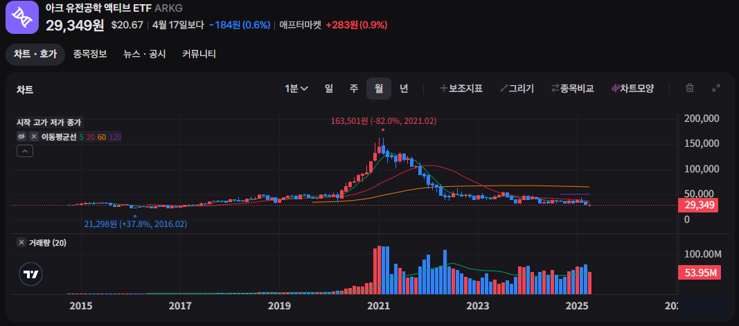 ARKG는 ARK Invest에서 운용하는 혁신 중심 ETF입니다. 유전체학, 바이오 혁신, 정밀 의료, 유전자 편집 등 최첨단 바이오 기술에 투자하는 상품으로, 그만큼 수익률 변동성도 큽니다.