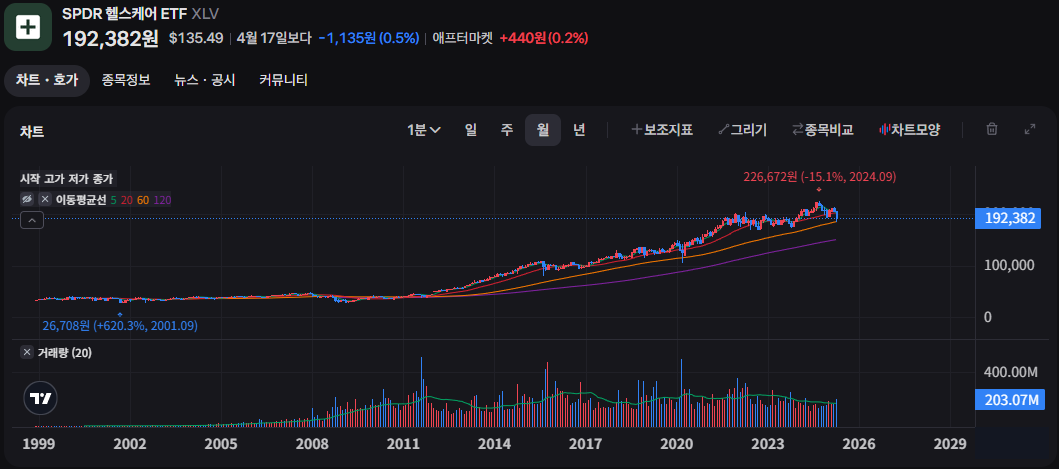XLV는 특히 경기 침체기에도 상대적으로 견고한 흐름을 보이며, 헬스케어 섹터의 방어적 속성을 잘 보여주는 ETF입니다.