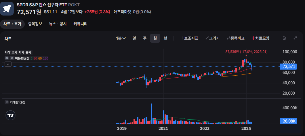 ROKT는 우주 탐사와 해양 탐험 같은 '미지의 영역'에 투자하는 특수 테마 ETF입니다. 항공우주 기술, 국방 관련 기업들이 다수 포함되어 있으며, 상대적으로 안정적인 수익률을 보여주고 있습니다.