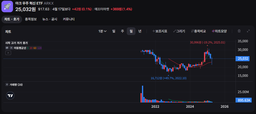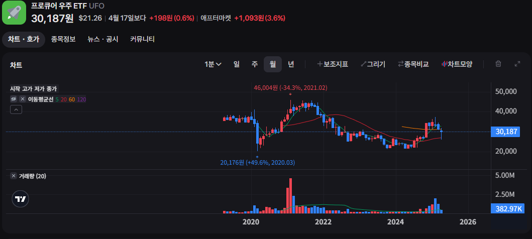 ARKX는 캐시 우드가 이끄는 ARK Invest의 ETF로, 단순한 우주 기업뿐 아니라 위성 데이터, AI, 드론, 로보틱스 등 혁신 기술 전반을 포함하는 것이 특징입니다. 다소 실험적인 포트폴리오로 인해 수익률은 변동성이 큰 편입니다.