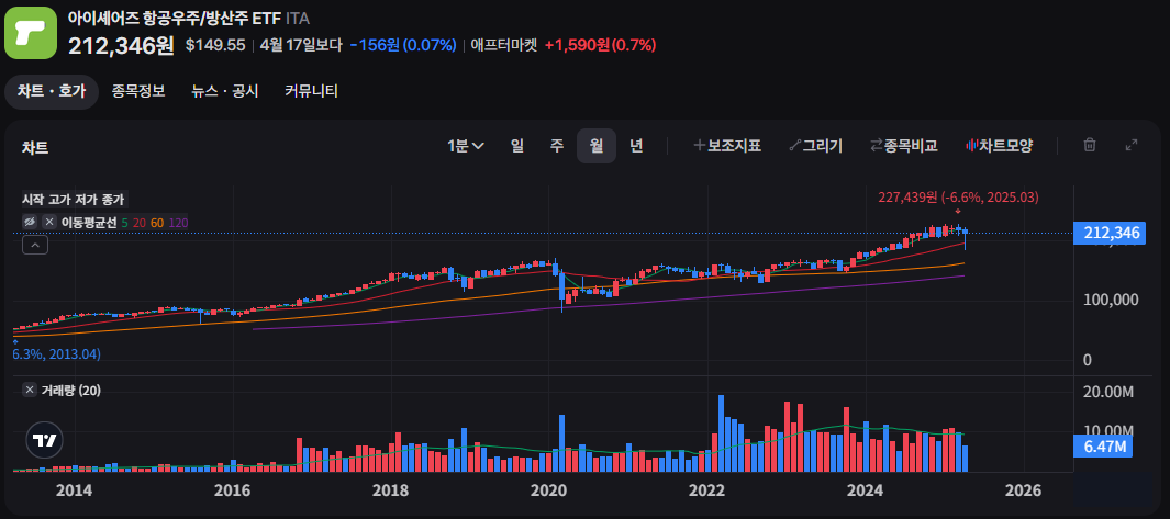 ITA는 전통적인 미국 항공우주 및 국방 기업에 투자하는 ETF입니다. 보잉, 레이시온, 제너럴 다이나믹스 등 탄탄한 대형 방산주 중심의 구성으로, 경기 방어적 성격이 강해 안정적인 수익률을 제공합니다.