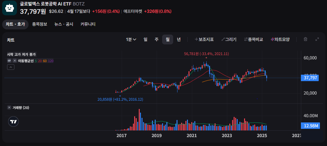 BOTZ는 로봇 기술과 인공지능을 융합한 산업군에 주목하는 ETF입니다. 주요 구성 종목으로는 엔비디아(NVIDIA), ABB, 인튜이티브 서지컬(Intuitive Surgical) 등이 있으며, 의료, 자동화, 반도체 등 다양한 영역을 포괄합니다. 상대적으로 대형 우량 기업 중심으로 구성되어 있어 안정적인 수익 흐름을 기대할 수 있습니다. 최근 1년 수익률은 약 25% 수준입니다.