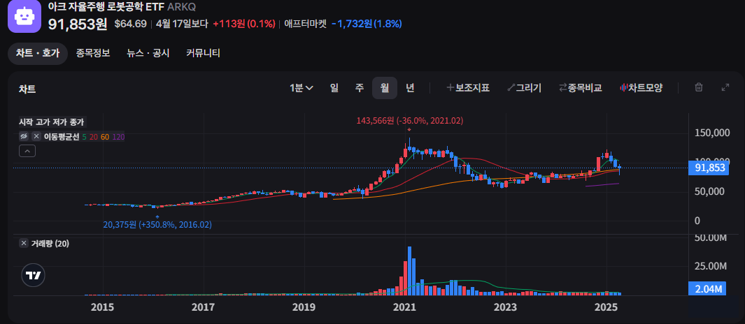 ARKQ는 ARK Invest의 대표 테마 ETF 중 하나로, 자율주행차, 로보틱스, 드론, 3D 프린팅 등 미래 산업 전반을 포괄합니다. 테슬라(Tesla), 유아이패스(UiPath), 트림블(Trimble) 등 기술 혁신 기업들이 주요 구성 종목입니다. 변동성은 크지만, 높은 수익률을 기대할 수 있는 테마형 ETF로 평가받고 있습니다. 최근 1년 수익률은 약 30%입니다.
